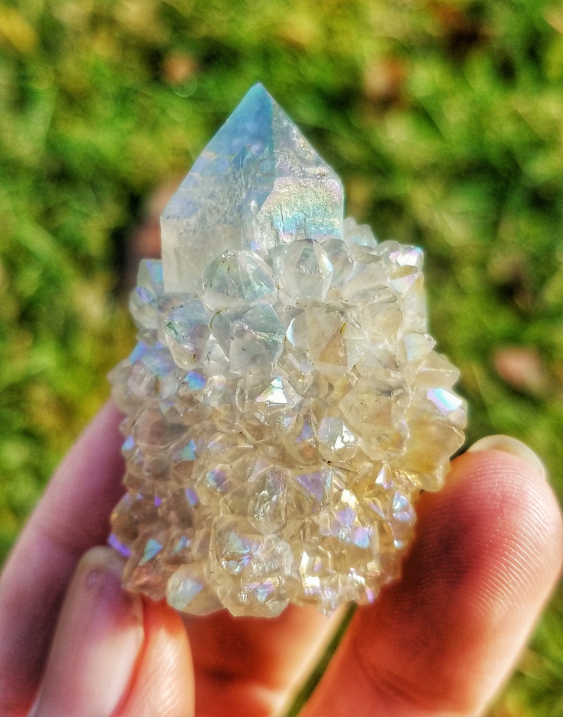 Angel Aura paired with Spirit quartz creates Harmony and Alignment. It takes all the crystal energies of the main stone and amplifies them over and over again in all the tiny points, each reflecting light back and forth to one another so all can bathe in the combined radiance of the whole.