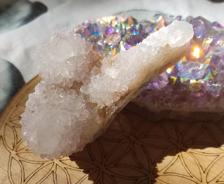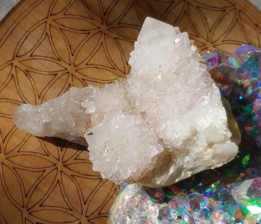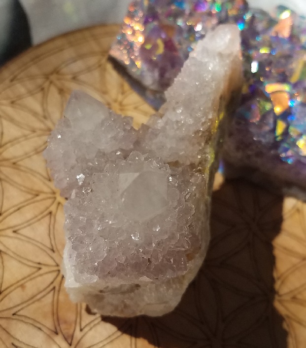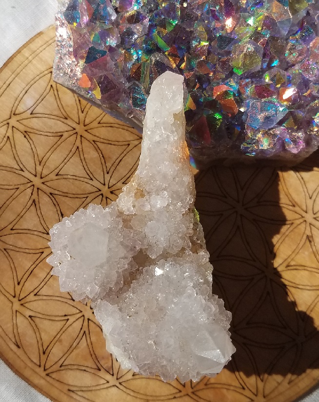 Spirit quartz (or cactus quartz) is a crystal of Harmony and Alignment. It takes all the crystal energies of the main stone and amplifies them over and over again in all the tiny points, each reflecting light back and forth to one another so all can bathe in the combined radiance of the whole.