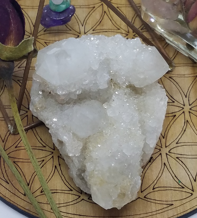 Spirit quartz (or cactus quartz) is a crystal of Harmony and Alignment. It takes all the crystal energies of the main stone and amplifies them over and over again in all the tiny points, each reflecting light back and forth to one another so all can bathe in the combined radiance of the whole.