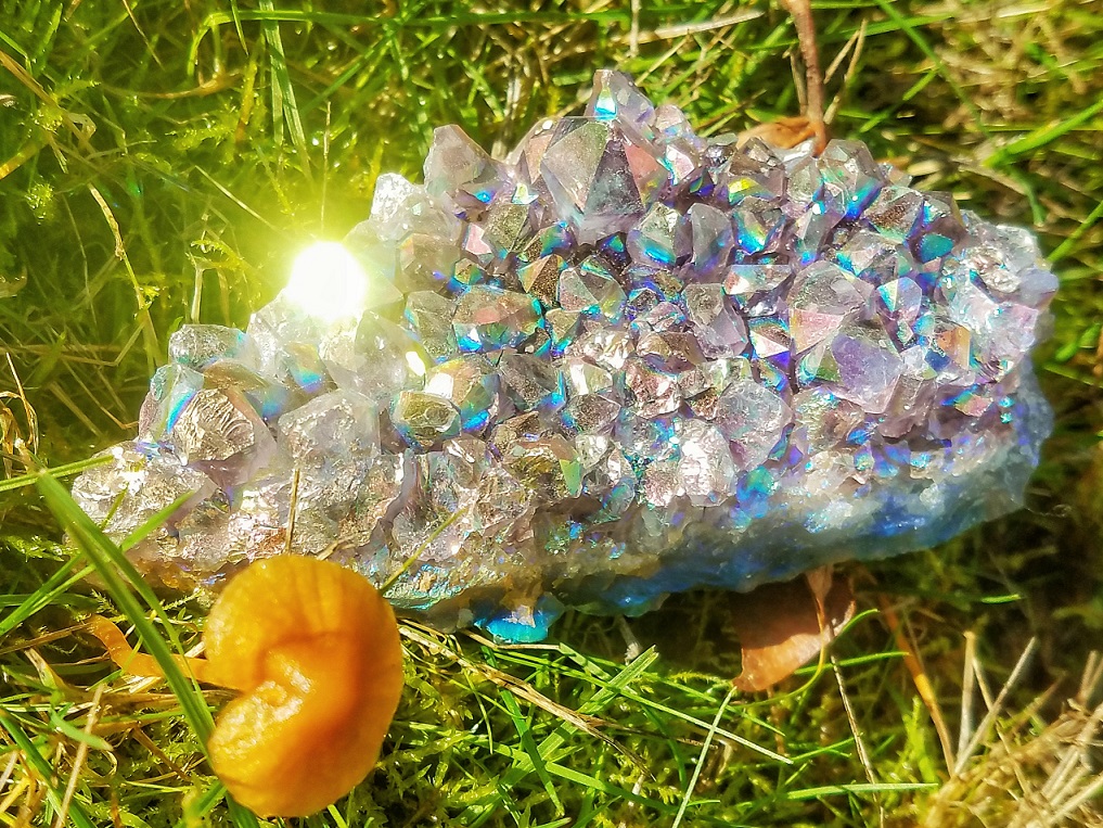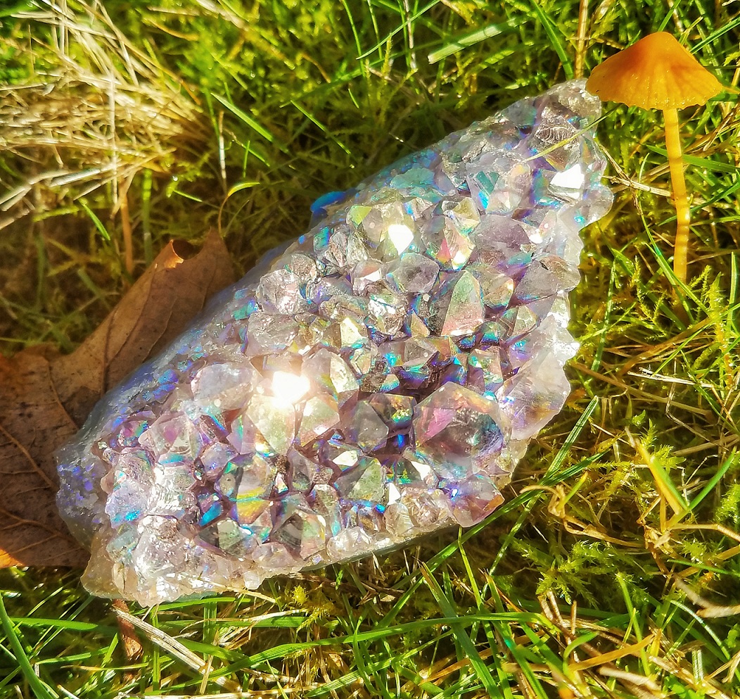 Aura Amethyst, or Rainbow Aura Amethyst, is Amethyst bonded with Platinum and Silver, sometimes Gold or other trace metals. It exhibits a light blue, rainbow and silvery iridescence like the gossamer wings of angels. It has a very loving and sweet energy, stimulating the spirit and elevating one’s mood. Meditating with this crystal allows one to enter a state of serenity and peace, purification and rest, and to go beyond the body to perceive and receive help from one’s angel guides.